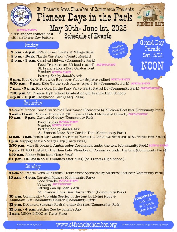 IMPORTANT: For safety reasons, the St. Francis Police Chief has ordered absolutely no throwing of candy from moving vehicles or floats. All candy/items must be handed out from walkers.